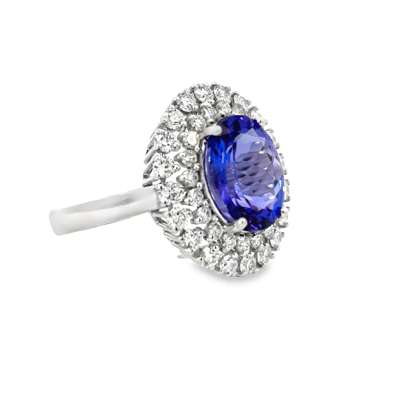 Metal: 18K White Gold1 Tanzanite Total Weight: 3.55ct40 Diamonds Total Weight: 1.06ctDiamonds Colour/Clarity: FG/VS-SIProduct ID: 194770Ring Size: